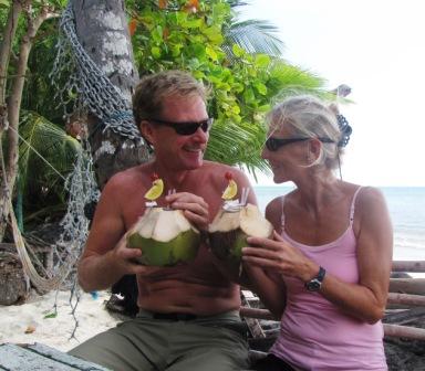 We don't have many pictures of Guanaja and Roatan as the weather was pretty wet and gloomy much of the time due to a series of cold fronts. And when it wasn;t we went diving. Diving was great at Roatan, possibly the best we have seen in the Caribbean. Relatively healthy corals with good diversity, fabulous, steep walls dropping into the deep blue, 100' visibilty, and lots of interesting fish. We also hung out with some great people in the Bay Islands. We'll never forget watching the Olympic gold medal hockey game with a bunch of other Canucks under the palm trees on the dock at Fantasy Island marina!